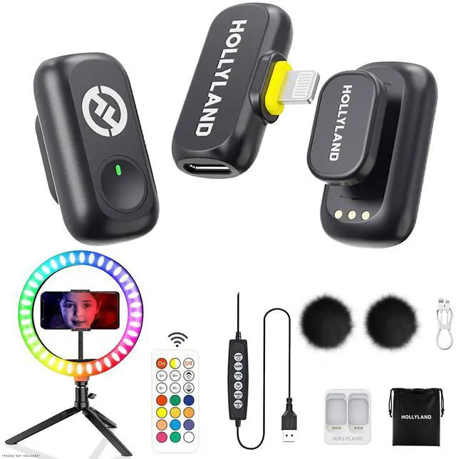 HOLLYLAND LARK A1 MINI DUO 2-PERSON WIRELESS MICROPHONE SYSTEM WITH LIGHTNING CONNECTOR FOR IOS DEVICES (SPACE GRAY, 2.4 GHZ) + 10" FULL COLOR RGB LED RING LIGHT WITH PHONE CRADLE REMOTE AND TRIPOD