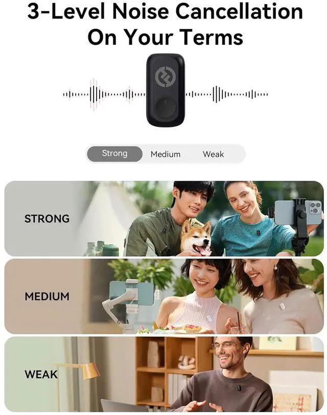 Three adjustable levels (Strong, Medium, Weak) ensure your voice stays natural and clear, whether you're recording indoors, outdoors, or in dynamic environments.