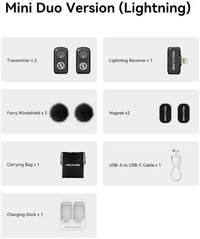 The Hollyland LARK A1 Mini Duo with Lightning Receiver is a dual-channel, digital wireless microphone system engineered for effortless iPhone connectivity and plug-and-play operationideal for streaming, vlogging, podcasting, and video production with two people speaking at the same time. The system includes two ultracompact, clip-on transmitters with built-in omnidirectional microphones for discreet, high-quality recording, a Lightning plug-in receiver for direct use with iOS devices, two furry windscreens for outdoor shoots, and a convenient charging dock for the transmitters.