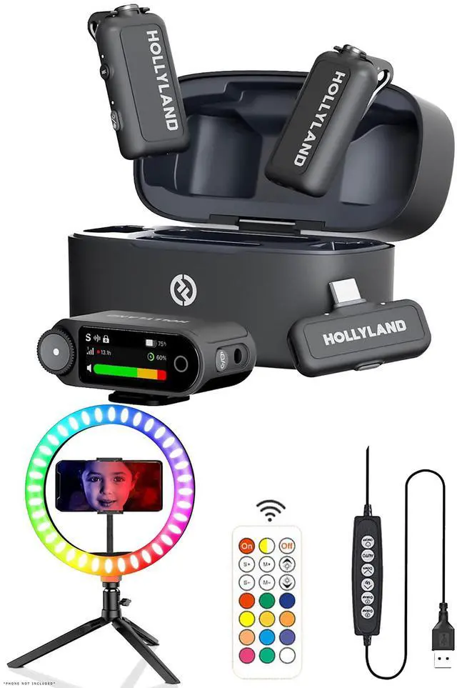 HOLLYLAND LARK MAX 2 COMBO 2-PERSON WIRELESS MICROPHONE SYSTEM FOR CAMERAS AND MOBILE DEVICES (SPACE GRAY, 2.4 GHZ) + 10" FULL COLOR RGB LED RING LIGHT WITH PHONE CRADLE REMOTE AND TRIPOD