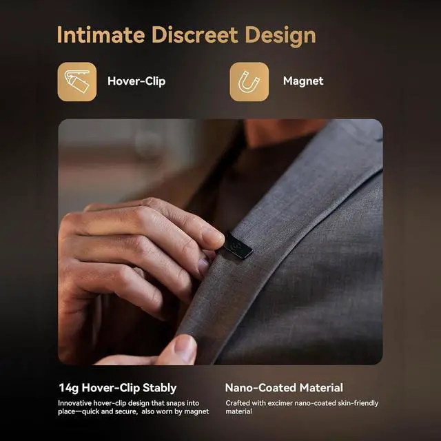 Intimate Discreet Design Mic Hollyland LARK MAX 2 wireless lavalier microphone compact transmitter weighs only 14g, with an innovative stable Hover-Clip and Nano-Coated Material design that snaps into placequick and secure, also worn by magnet to offer exceptional comfort all day.