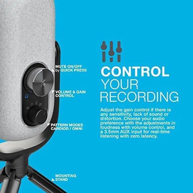 • CONTROL YOUR RECORDING: Adjust the gain control if there is any sensitivity, lack of sound or distortion. Choose your audio preference with the adjustments in loudness with volume control, and a 3.5mm AUX input for real-time listening with zero latency.