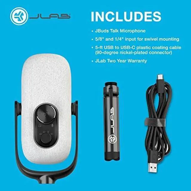 INCLUDES: Epic Talk Microphone with 5/8 and 1/4 inputs for swivel mounting, 5-foot USB to USB-C cable (90-degree gold-plated connector), JLab Two Year Warranty.