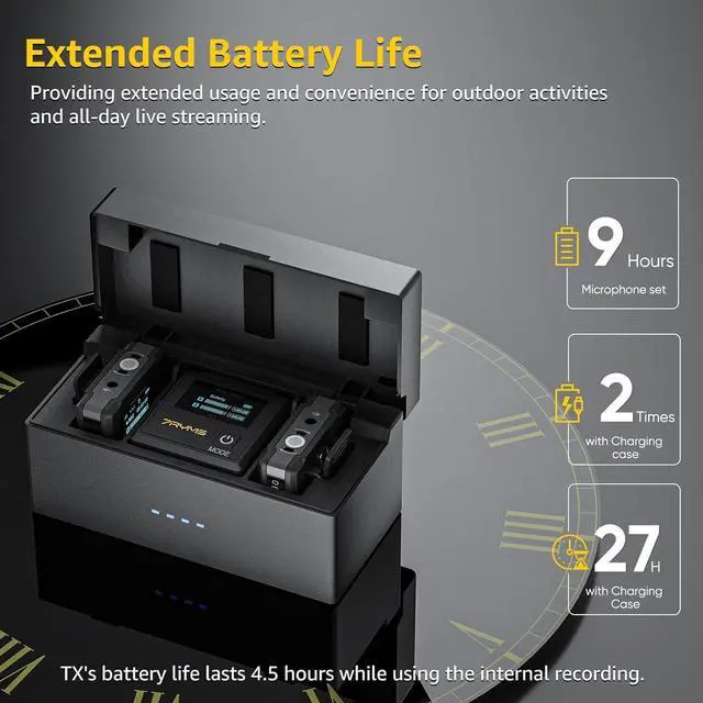 With up to 9 hours of operating time for one RX and TX. Furthermore, the fully charging case can recharge the entire microphone set twice, providing extended usage and convenience for outdoor activities and all-day live streaming.