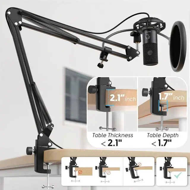 Easy to AttachThe streaming microphone for PC includes adjustable boom studio scissor arm stand that features a heavy-duty combo mount consisting of a sturdy C-clamp and a detachable desktop mount. With 13" fixed horizontal arm and offers a 30" reach, the low-profile, table-hugging design of audio recording microphone allows on-air talent to perform without facial obstruction to record in podcasting or make dubbing sounds for videos, use voice chat in Discord or online conference on Zoom or Skype.