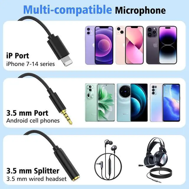 [UNIVERSAL 2-IN-1 CONNECTION]: This mini microphone for iPhone and Android devices has dual interfaces and a universal 2-in-1 design. This small microphone is compatible with iPhone 7-14 series and Android phones. Please note that this mini mic is not compatible with the iPhone 15 series.