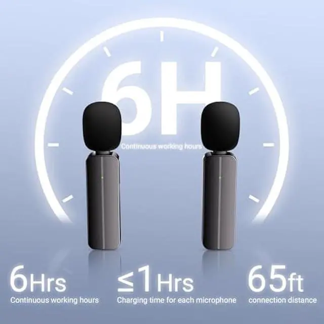 65FT AUDIO RANGE & 6H WORKING TIME- A highly sensitive microphone that is perfect for capturing clear audio from 65ft far away. Built-in large capacity rechargeable battery and low power chip, this mini wireless lavalier microphone provide more than 6 hours of battery life and only 1 hours to get fully charged.