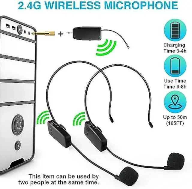 For Two PeopleThis wireless microphone can be used by two people at the same time. Freely match the headset mic you want, of course, you can also use only one microphone. The working method is to pair two transmitters with a receiver, so your device only needs to have a microphone jack to complete the work of two people. No set, plug and play. the transmission distance upgrade to 160 Feet (50m).