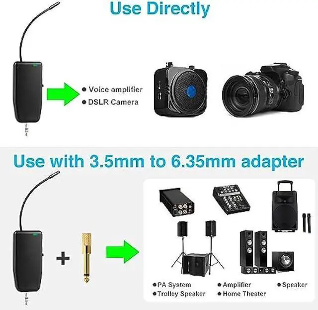 Easy Charging & Wide CompatibilityThe transmitter and receiver are built-in rechargeable lithium-ion batteries that can offer about 8 hours working time. Usb cable has two micro USB V 2.0 to charge for the transmitter and receiver simultaneously. Fully charge is only 2-3 hours. The plug on the receiver is 3.5 mm. For 6.35 mm amplifiers, please use the additional 6.35 mm adapterincludedto connect more equipments. which can be used with portable pa system, voice amplifier, mixer, bus speaker etc.