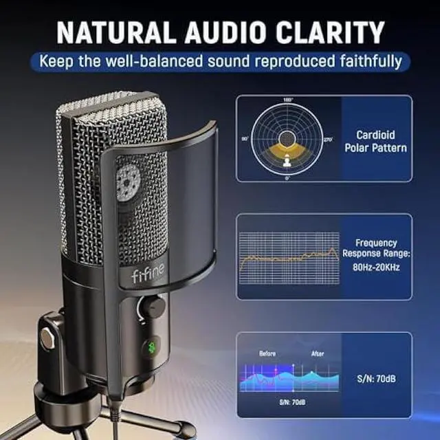 [Rich, Balanced Audio] Unleash the full range of your voice via the podcast microphone with wide response frequency of 80Hz-20kHz. From deep bass to airy highs, studio microphone for PC faithfully reproduces nuance, delivering full-bodied audio output for your vocal. With a signal-to-noise ratio of up to 70dB, background hum and creaking noises fade into the background, leaving your voice crisp and clear.
