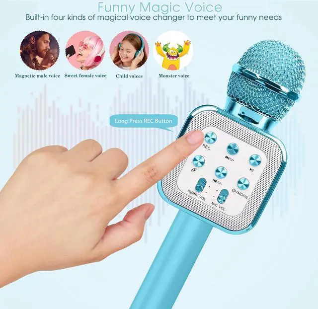 [Funny Magic Voice] Our karaoke microphone with voice disguising function will bring more fun to your kids and family. Built-in DSP audio processing chip, offer 4 magical sound-changing, includes Magnetic male voice, Sweet female voice, child voices, and monster Sound, By hold the " REC" button on the microphone, you can choose a different sound to meet your funny needs