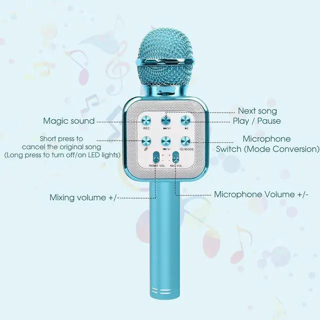 [Bright LED Karaoke Microphone ] The lightweight handheld karaoke microphone is mini size and easy to hold, the comfortable touch feeling both suits for all ages people. With the increase of the rhythm and volume, the LED light becomes brighter, creating an atmosphere of being on the stage, allowing you to enjoy your singing more. I bet people who receive this microphone will very love it