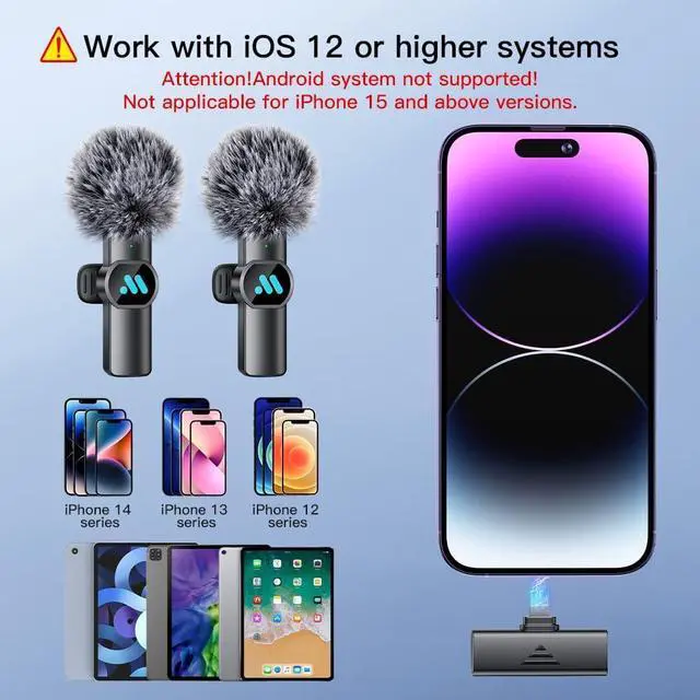 Included Components Product manual, receiver, four sponge microphone covers, two iphone mini wireless microphones, data cable with type-c connector Product manual, receiver, four sponge microphone covers, two iphone mini wireless microphones, data cable with type-c connector