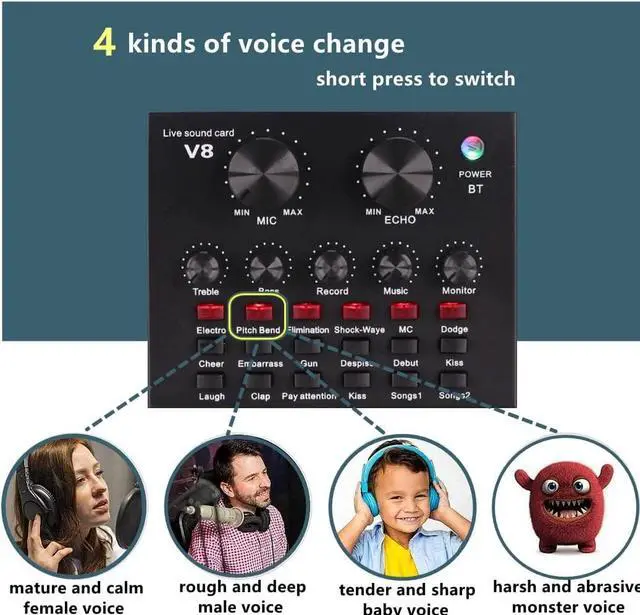 - audio interface for pc has four sound changes (female, male, child and monster), change your voice, chat online anytime, anywhere, and talk with friends to make your voice more interesting.