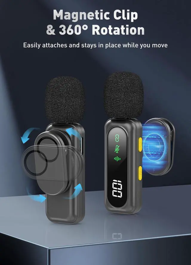 360° Magnetic Mini MicThis mini microphone features a 360° rotatable magnetic design, allowing you to easily position it close to the sound source for clearer and more accurate voice capture. The strong magnet clips securely onto turtlenecks, jackets, or thicker clothingmaking it perfect for creators using a wireless microphone for iPhone or Android devices.