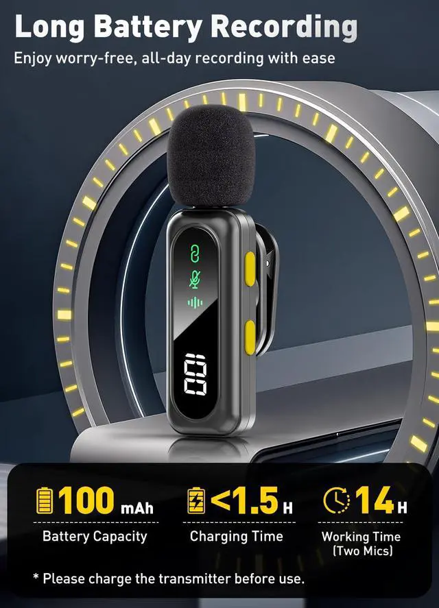 14-Hour Battery LifeEach wireless mic is powered by a built-in 100mAh battery, providing up to seven hours of use per unit or up to 14 hours when both units are used together. Perfect for interviews, YouTube videos or long filming sessions, this wireless lavalier microphone ensures uninterrupted shooting.
