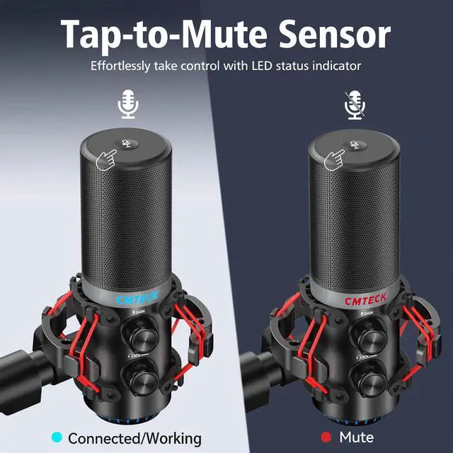 Tap-to-Mute with LED Indicator - This microphone simplifies muting with a convenient tap-to-mute function located on the top. An LED mic status indicator shows whether it's in use (green) or muted (red), preventing accidental broadcasting mishaps.