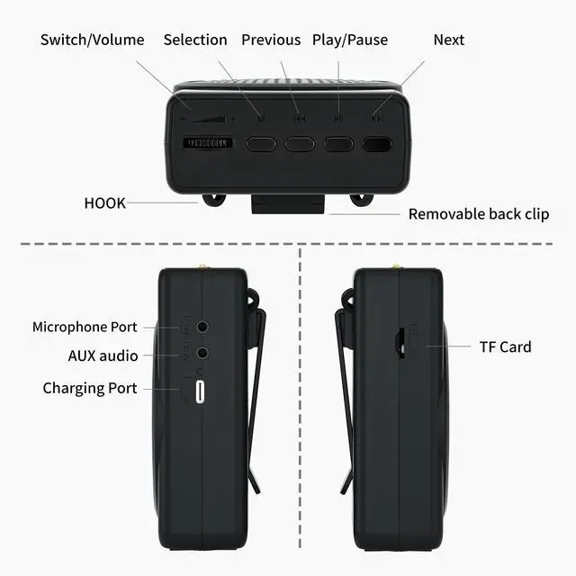 (features) voice amplifier can be used with the help of a belt hanging around the neck or tied around the waist, support for TF card playback , repeat playback of a single song, loop playback of all the music and switching songs