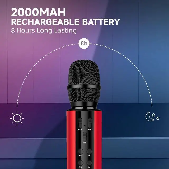 Stable Connection, Long-Lasting Singing: Advanced Bluetooth 5.0 technology provides a stable and smooth 10-meter wireless transmission range with strong anti-interference capabilities. A built-in 2000mAh large-capacity battery provides approximately 8 hours of singing, eliminating battery worries and allowing you to enjoy karaoke to the fullest.