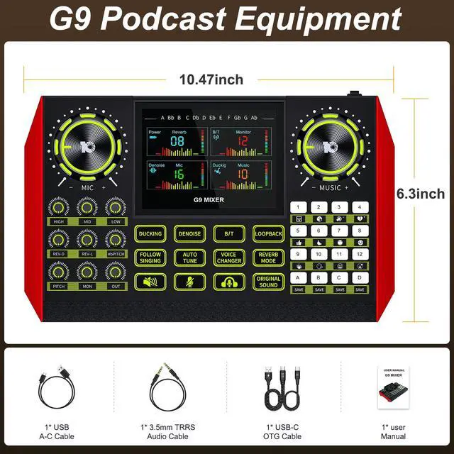 This G9 audio mixer supports ¼" dynamic microphone, ?" 5V condenser microphone and ?" TRRS headset microphone. Tips: It DOES NOT support USB microphone.
