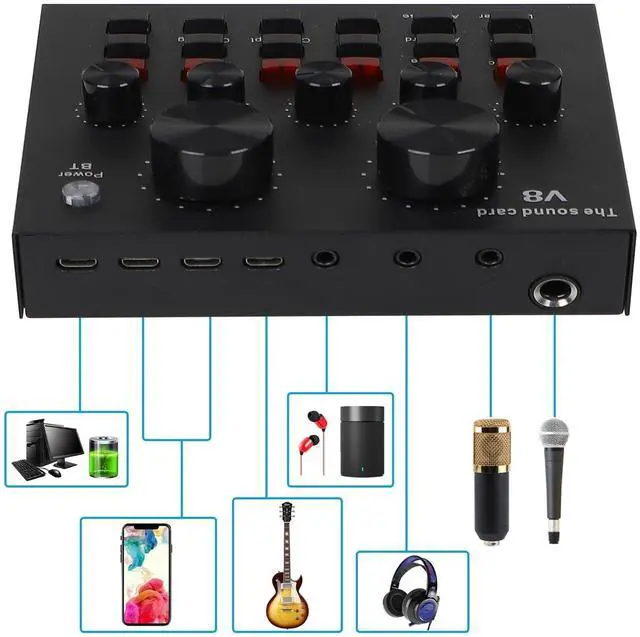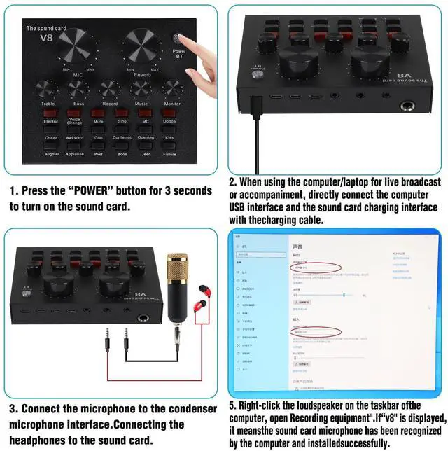 1. To live broadcast on a computer/laptop, you need to connect the charging port of the sound card through the charging cable.