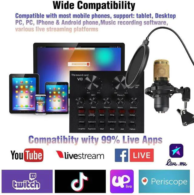 Condenser Microphone Bundle, Live Sound Card, Adjustable Boom Arm, Shock Mount, Metal Mic Pop Filter, Sponge Pop Filter Cover, Earphone, Audio Cables and Power Cable, Set of 11 Mic Kit