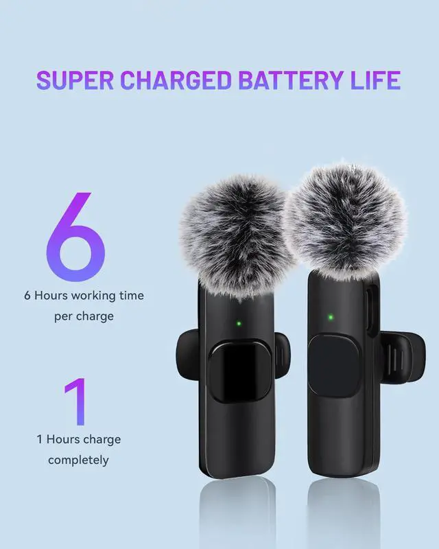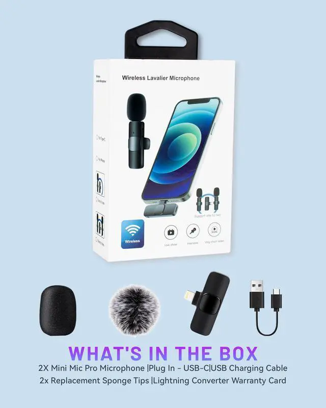 | Included Components | A product manual, A receiver, Four sponge microphone sleeves, Two mini wireless microphone for iphone, A data cable with a type-c interface |
