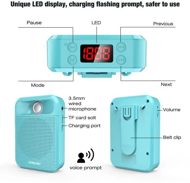 This speaker with microphone headset with multiple modes, supports one-key switch, one-key loop and repeat function. Voice prompt for mode select which help to find the mode you wanti easily in a light dark or movement environment.User friendly to opearte.