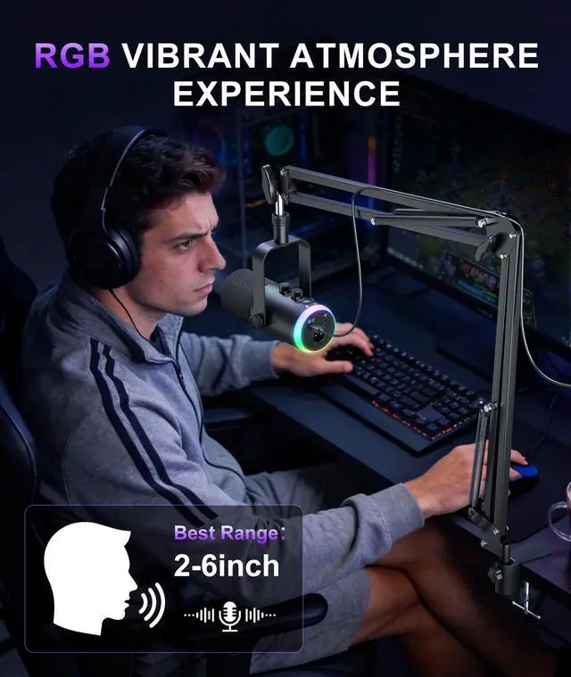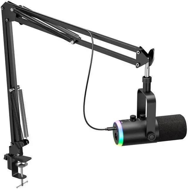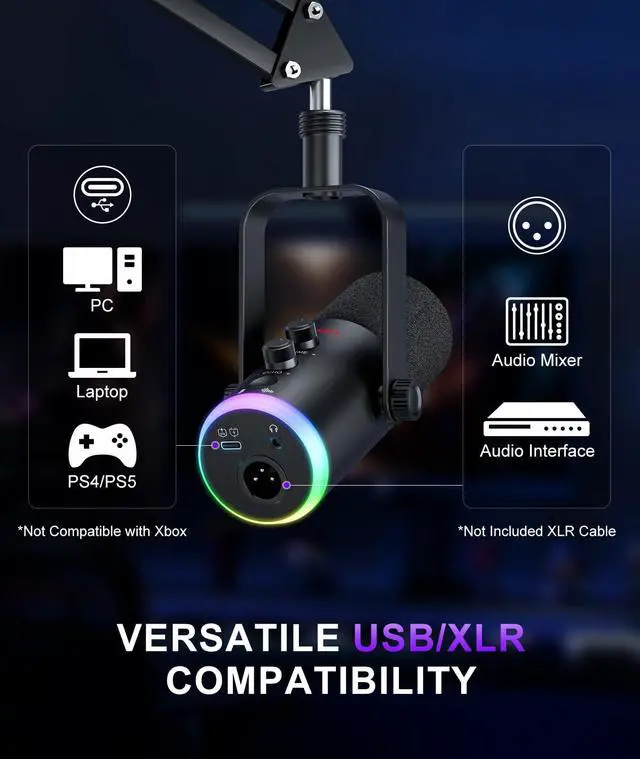 Dynamic Gaming Microphone, USB-C/XLR Podcast Mic with Boom Arm Stand for Recording Streaming Singing, RGB Light, Mute Button, Headphone Monitor for PC, TikTok, YouTube