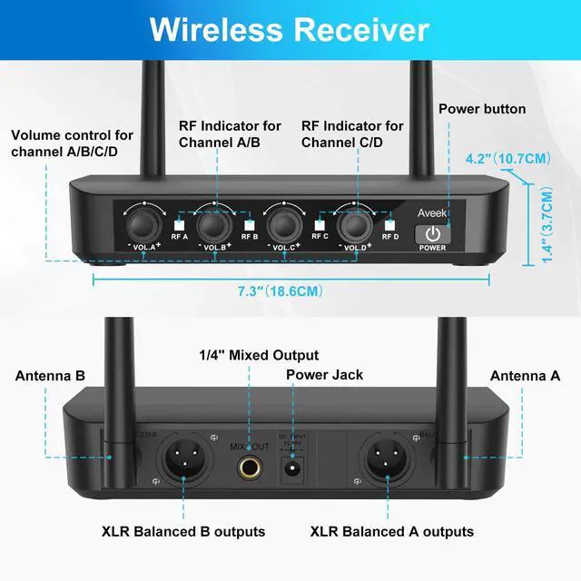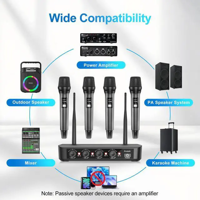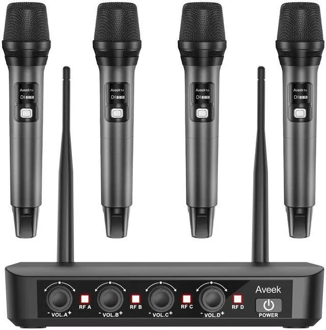 All four wireless microphones can be used simultaneously, making it perfect for group singing, band performances, or panel discussions.