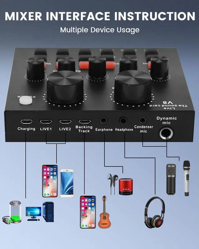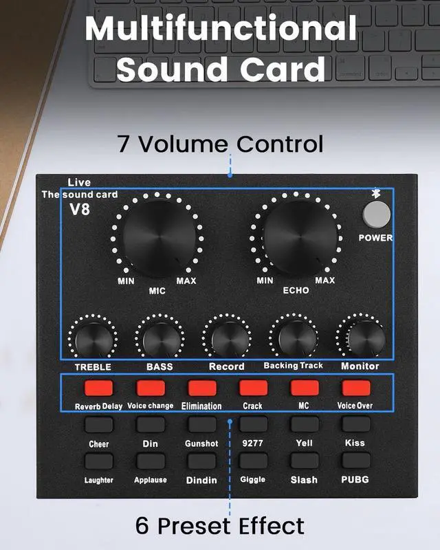 [Born for Live Broadcasting]--Five independent channels set on the mixer can individually control the volume of microphone, line input, headphone and line output channels. 2 modifiable tones (treble, bass) make this audio interface more entertaining and meet more live recording needs.