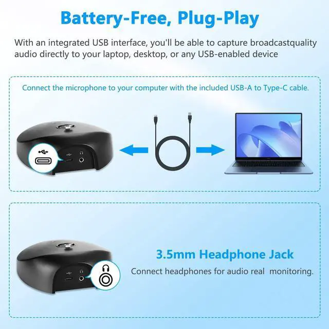 Plug Play USB Mic for Computer: The microphone base has a Type-C audio input and can be connected to your computer using the included USB-A to USB-C Cable, plug and play, no batteries required