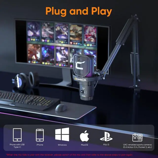 Plug and Play, Compatible With MOST OS Comica Ejoy Uni is compatible with a wide range of devices, including PS4/5, Windows Mac OS PC Computer Laptop, iPhone, iPad, Tablet, Type C devices, and Android. This gaming microphone USB mic offers seamless compatibility with your favorite gaming devices.