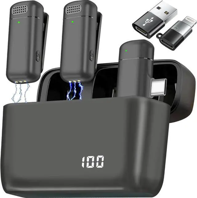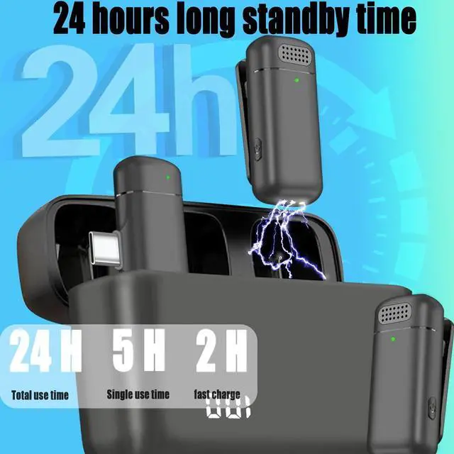 24 Working Time with LCD display Charging CaseWireless lapel microphone transmitter has built-in rechargeable battery with working time up to 5 hours. With a charging case, they can works up to 24 hours. It has LCD display on charging case to clearly tell us the remaining power. Our wireless microphones can 360° record crystal-clear audio to your devices. Our lavalier microphone can effectively identify and restore the original sound in a noisy environment, gives best clear timbre. Perfect for film make, Vlog, Youtube, mobile journal, content creating.