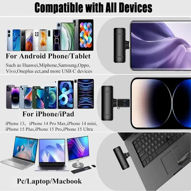 Double Noise ReductionUpgraded low-cut + ENC environmental noise reduction accurately reduce noise of different frequencies and retain the original texture of the human voice. Utilizing a wireless microphone compatible with both iOS and Android devices ensures versatility across various platforms. It is seamlessly compatible with iPhones 15/14/13/12, Android smartphones, iPad and laptop.
