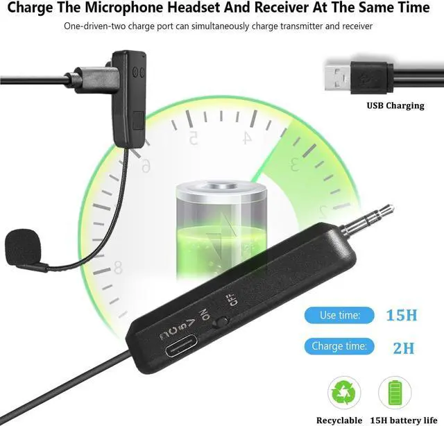 Rechargeble Microphone and receiverThe microphone and receiver are both built-in 1200mAh rechargeable lithium-ion battery. work time up to 7 plus hours with charging time 3-4 hours. The charging cable are included in package, support charging the dual microphones and receiver in one cable at the same time.