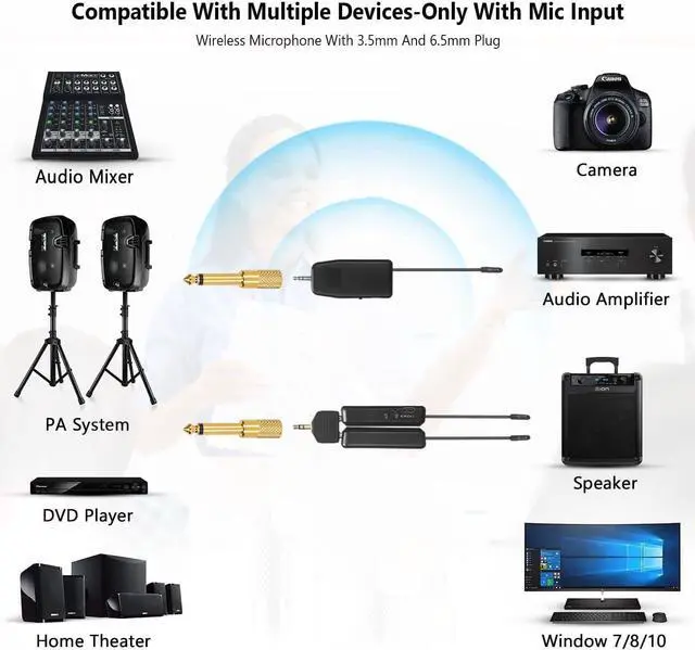 Plug and Play and Multiple CompatibilityPlug and Play, 160ft (50m) stable transmission distance at open area, delivering loud, clear and high fidelity sound quality to your audience. Plug the receiver to a 6.35 mm or 3.5 mm Mic Jack of audio equipment. Compatible with devices with 6.35 mm or 3.5 mm MIC interface, such as Party speakers, Singing machine, Amplifier, PA system, Audio interface, Truck speaker system, Dome speaker system and etc.