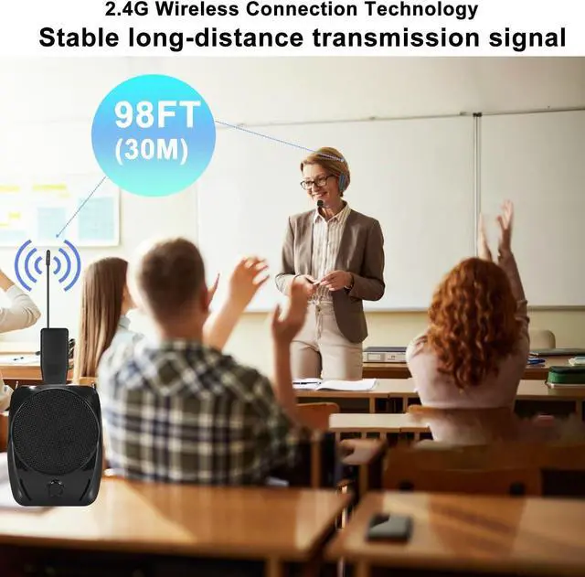 2.4G Wireless TransmitterAdopted adavanced 2.4G wireless transmission technology. The wireless headset microphone system is easy to pair, just turn on the transmitter and receiver power switchers, the blue light will flash for appoximately 2s, indicator light stops flashing after succesful match, and then you can use the wireless headset microphone for vouce amplification, no further action.
