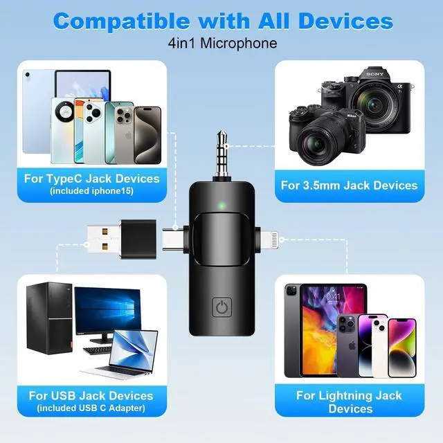 4 in 1 Powerful Compatibility: Weton upgraded mini mic wireless includes 2 transmitters and a 3-in-1 universal receiver and a Extra USB adapter, which is widely compatible with various devices, Compatible with android smartphones, iphone (including iPhone 15), iPad, laptops, personal computers, camera etc. The receiver can be connected to two microphones at the same time. (Note: Please turn on the " OTG" function of your USB C device before pairing)