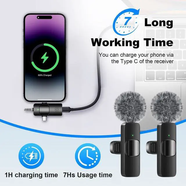 Rechargeable Transmitter and Receiver: The lapel microphone transmitter and receiver have built-in rechargeable batteries, they can be used for up to 6 hours after about 2 hours of charging. Furthermore, this microphone for iPhone also supports charging while recording.
