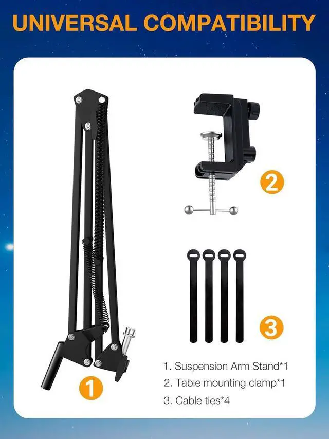 Table Clamp Base - Suspension boom arm comes with one desk clamp, can clip to any desktop up to 1.89 " / 4.8 cm thick. The sponge on the mic stand desk base could protect your desk without any scratches when you swivel side screw.