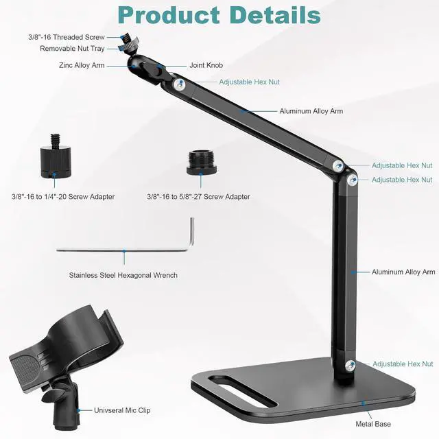 Flexible Adjustable: Twisting the joint knob of top arm, the ball head can 360°ratation, 3/8" -16 threaded screw can 180° tilt, we provide a stainless steel hexagonal wrench, customer can adjust hexagonal nut on the arm with wrench, arm between and arm can 180° rotation, arm between and base can 180° rotation, the whole arms can fold together, one buttton on mic clip for adjusting 180° tilt.