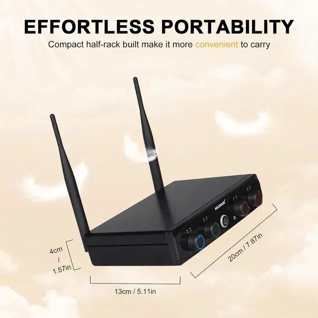 EASY PORTABILITY: This 4-channel wireless conference microphone system offers effortless portability with its compact half-rack design, making it perfect for on-the-go use in meetings, lectures, or conferences. The receiver' s built-in antenna of the microfono inalambrico eliminates the need for frequent assembly and disassembly, making it easy to carry and install, and contributes to smooth operation