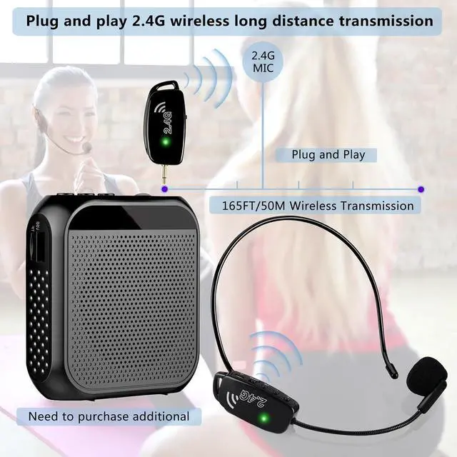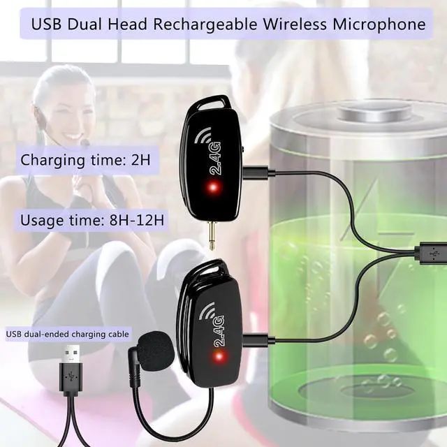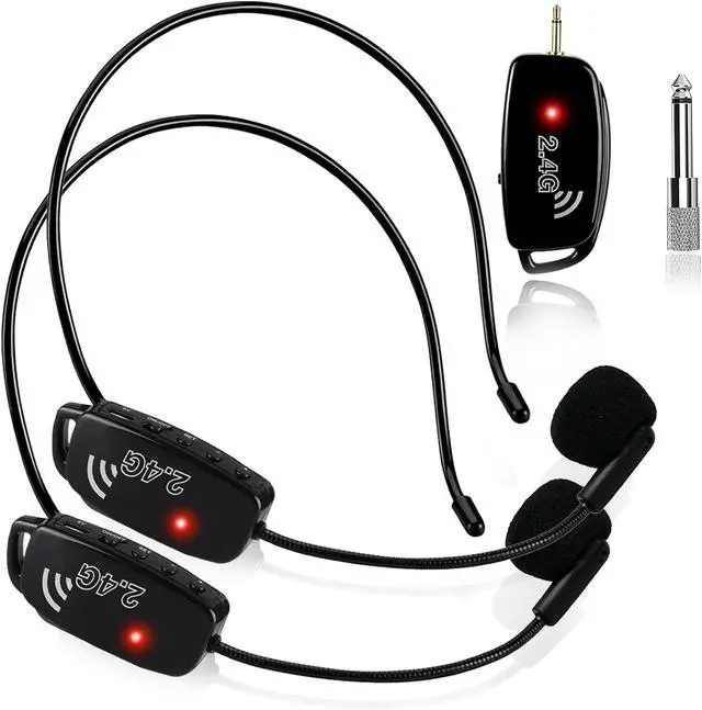 Widely compatible with multiple scenarios: Suitable for two people using wireless head-on 2.4G microphone at the same time. Receiver plug 3.5 mm 1/8' ' & 6.35 mm 1/4' ' microphone, which is very suitable for tour guides/fitness coaches/yoga teachers/classroom teachers/singing/conferences/speech/online podcasts/outdoor live broadcasts/yoga coaches/dance coaches/promotions/games/loudspeakers/voice amplifiers/PA systems/etc.