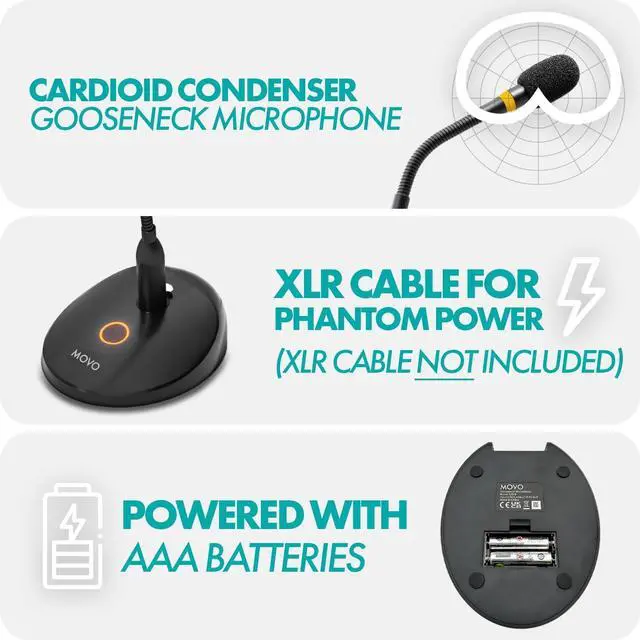 MULTIPLE POWER OPTIONS: The GM-9 podium microphone can be powered via 2 AAA batteries (not included) or 48V Phantom Power.