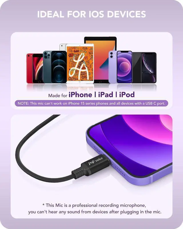 Made for iOS Devices - PoP voice professional lavalier lapel microphone is made for iOS devices for iPhone 12, 12 Pro, for iPhone 11 Pro, 11 Pro Max, 11, for iPhone XS, XS Max, for iPhone XR, X, 8, 8 Plus, 7, 7Plus, 6, 6S, for iPod touch / for iPad mini.