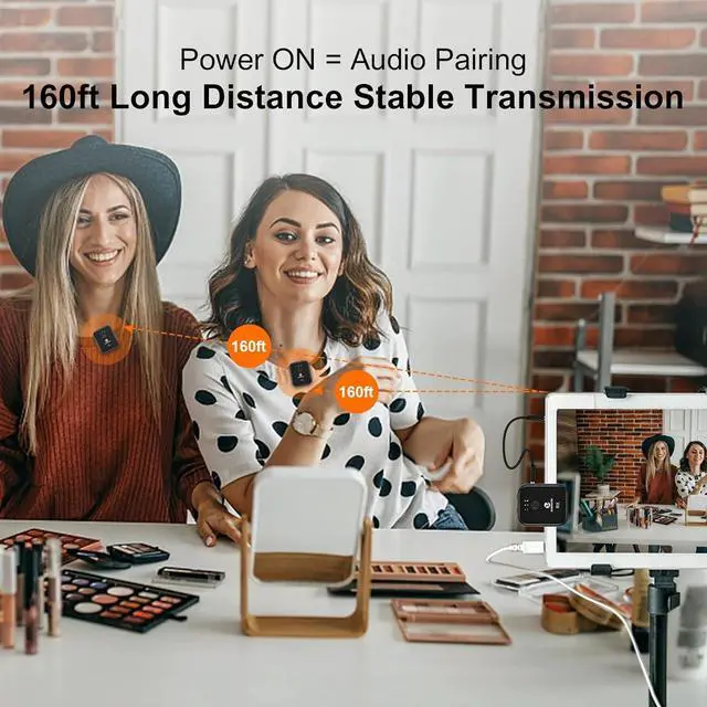 Wireless microphone for vlogging supports of frontal transmission at least 160 ft in open ground without signal interruption. The windscreens ensures that the mic work great in any wind.