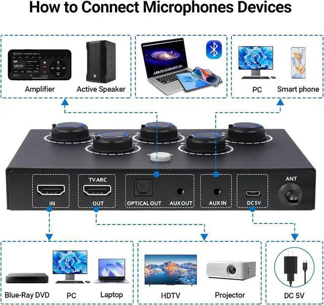 Adjustable SoundWireless microphone system with rotary adjustable controls. You can easily adjust the volume of REVERB, TONE, MICROPHONE and MUSIC as needed. Output mixed audio signals to speakers or other sound systems via HDMI, 3.5 mm (1/8 inch) stereo or optical output jacks. (HDMI cable not included)