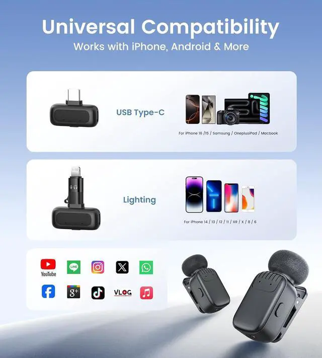[Compatible with iOS & Android] This wireless microphone for iPhone and Android includes both a Type-C receiver and lightning adapter, making it compatible with iPhone 15/16 series, Samsung, Google Pixel, OnePlus, and