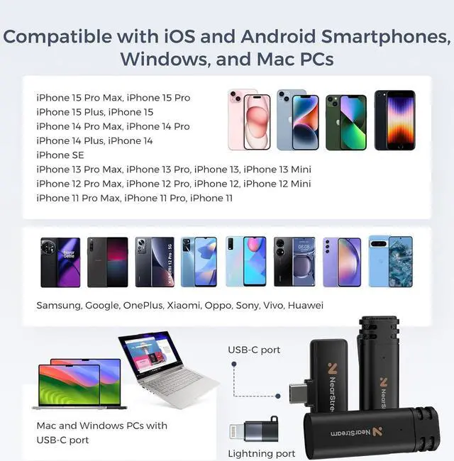 Compatible with Almost All Smartphones and Tablets: Equipped with both Type-C and Lightning adapters, the wireless lapel mic is compatible with nearly all Android and iOS smartphones, as well as tablets, PC. It' s ideal for vlogging, interviews, livestreaming, YouTube, TikTok, and podcasts.